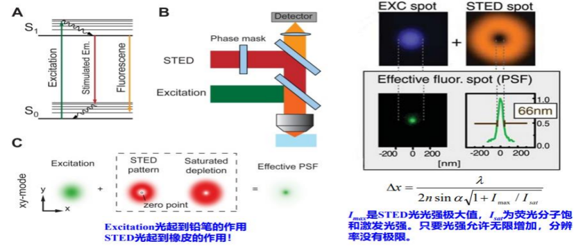STED 显微镜的工作原理是抑制非焦点区域的荧光发射,从而提高分辨率。在实际应用中,它为生命科学等相关领域的研究提供了重要的技术支持。